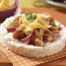 BBQ Chicken Snack Recipe | SparkRecipes rice cake, chicken, red onion, coriander, barbecue sauce, cheddar cheese ---Combine Chicken, barbeque sauce and red onions in small microwave bowl; mix well.---Microwave on HIGH for 30 seconds, or until heated through.---Divide and spread mixture evenly over rice cakes.---...