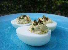 | A Little Bit Spicy Deviled Eggs! Recipe - Food.com chili dried/powder, hot sauce, pepper, paprika, chives, eggs, mustard, salt, salad dressing, mayonnaise These deviled eggs are just a little bit spicy! Add your favorite hot sauce(chipotle is really good) and enjoy! Adapted from The Deviled Egg Gourmet. Serving Size: 1 (52) g Servings Per Recipe: 6 AM...