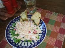 | Crab Pasta Salad Recipe - Food.com green pepper, spring onion, tomato, crab, salad dressing, mayonnaise, parmesan cheese, pasta Saw this recipe on Taste of Home and had to try it. Their recipe called for a creamy Italian Salad Dressing and I used a Lite version, and called for 1 cup fresh broccoli florets, which was the only t...
