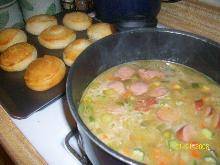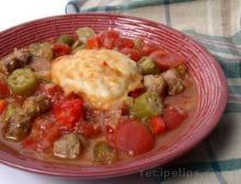 | Spicy Gumbo and Biscuits Recipe - RecipeTips.com baking mix, chicken stock, sassafras, cayenne pepper, onion, garlic, okra, tomato, sausage, milk A zesty soup topped with biscuits. PREP 15 mins COOK 45 mins In a medium saucepan over medium heat, cook sausage for about 5 minutes. Add onion, garlic, and sweet pepper, cook an additional 5 minu...
