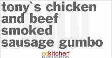 | Tony's Chicken And Beef Smoked Sausage Gumbo Recipe | CDKitchen.com creole seasoning, tomato sauce, roux, bell pepper, gravy, sassafras, parsley, marjoram, basil, spring onion, onion, garlic, celery, okra, hen, beef, sausage, water A recipe for Tony's Chicken And Beef Smoked Sausage Gumbo made with hen or fryer, dried basil, dried marjoram, Creole seasoning, beef smoked sausage, celery Put hen in a stock pot with enough wate...