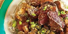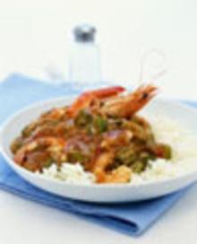 | Seafood Gumbo Recipe chicken breast, turkey sausage, green bell pepper, hot sauce, chicken stock, olive oil, sassafras, onion, garlic, okra, tomato, shrimp This Southern specialty is a rib-sticking favorite! But this recipe has a fraction of the fat of the original. 1. In a large saucepan, heat oil over medium heat until hot but not smoking. Add sausage;...