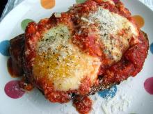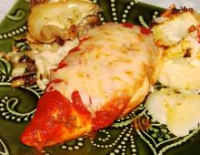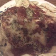 | Chicken Parmesan Recipe chicken breast, spaghetti sauce, olive oil, eggs, parmesan cheese, mozzarella cheese, bread crumbs, milk Chicken breaded and fried then baked in sauce with mozzarella and parmesan cheeses ! Pound chicken breasts to 1/2 inch thickness Whisk together egg and milk Dip each chicken breast into egg mixture ...