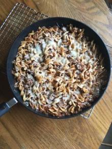 | Pizza Skillet Recipe - Food.com tomato sauce, spaghetti sauce, ground beef, onion, noodles, mozzarella cheese, water A quick and easy supper for the working Moms and Dads out there. This is one the kids will like. Serving Size: 1 (214) g Servings Per Recipe: 6 AMT. PER SERVING % DAILY VALUE Calories: 322.4 Calor...