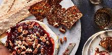 | Cranberry Baked Brie Recipe | MyRecipes brie cheese, cranberry sauce, pecan, nutmeg, brown sugar, spiced rum Make an easy and elegant holiday appetizer by topping a round of baked Brie cheese with sweetened cranberry sauce and toasted pecans. Serve with assorted crackers, gingersnaps, apple slices or pear sl...