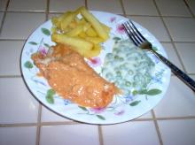 | Creamy Baked Fish Fillets Recipe - Food.com butter, whiting fish, hot sauce, paprika, tilapia, sole, haddock, flounder, cod, fish, salt, parmesan cheese, bread crumbs, sour cream It just can't get much easier than this! Serving Size: 1 (305) g Servings Per Recipe: 4 AMT. PER SERVING % DAILY VALUE Calories: 441 Calories from Fat 175 g 40 % Total Fat 19.5 g 29 % Satura...