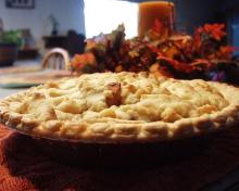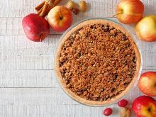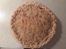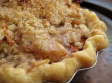 | Apple Crumble Pie Recipe | CDKitchen.com butter, nutmeg, cinnamon, apple, pastry, vegetable fat spread, sugar, flour A simple pie with a sweet apple filling and a buttery crumble topping. Preheat the oven to 400 degrees F. Combine the apples, sugar, flour, cinnamon, and nutmeg in a bowl. Toss to coat the apples in t...