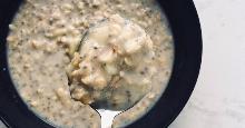 | Porridge with Egg&Banana Recipe | SparkRecipes chia seed, oats, banana, eggs, honey, water A very generous portion of fluffy, wholesome porridge packed with protein and nutrients 1. Bring 1 cup of water to a boil. Lower to medium heat and add 1/2 cup of oats. Let simmer until the oats have ...