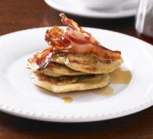 | Banana pancakes with crispy bacon & syrup recipe | BBC Good Food butter, pancetta, banana, eggs, bacon, baking powder, maple syrup, brown sugar, self raising flour, milk Treat yourself to a lazy brunch with these American-style fluffy pancakes with pancetta and maple drizzle, from BBC Good Food. STEP 1 Heat the grill to high. Arrange the bacon on a baking tray lined...