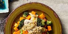 | Dijon Chicken with Roasted Broccoli & Butternut Squash Recipe | EatingWell chicken breast, chicken stock, olive oil, thyme, pepper, parsley, butternut squash, onion, garlic, broccoli, mustard, salt, parmesan cheese, white wine Precubed butternut squash is a timesaver in this easy baked chicken recipe. Look for it in the produce section. Instructions Checklist Step 1 Position racks in upper and lower thirds of oven; prehea...