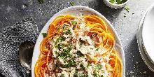 | Butternut Squash Alfredo with Chicken & Spinach Recipe | EatingWell butter, chicken, chicken stock, cornstarch, pepper, parsley, nutmeg, butternut squash, garlic, spinach, parmesan cheese, white wine, sour cream, water If you're not feeling like regular pasta tonight, turn to butternut squash noodles. These delicate veggie strands are a great base for any number of sauces and toppings, like this creamy and decad...