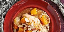 | Weeknight Honey-Orange Chicken with Butternut Squash Recipe | EatingWell chicken thigh, red pepper, quinoa, cornstarch, almond, ginger root, butternut squash, onion, garlic, soy sauce, salt, honey, orange juice Combine orange juice, cornstarch, soy sauce, honey, ginger, garlic, salt and crushed red pepper with chicken and butternut squash in this delicious slow-cooker recipe. Serve over high-protein quinoa, ...