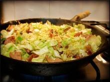 | Cabbage Noodles and Sausage Recipe | SparkRecipes butter, cabbage, sausage, noodles Quick, cheap, easy, and yummy Heat approximately 10 cups of water to boiling then add noodles and cook according to package directions. While waiting for water to boil, cook sausage in large frying pa...