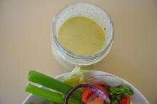 | Easy, Creamy, Low-Fat Caesar Salad Dressing Recipe - Food.com garlic, mustard, balsamic vinegar, yogurt (plain), water This recipe uses drained yogurt as the foundation for a creamy, low-fat dressing. Serve over a salad of romaine lettuce, seasoned chicken and grated Parmesan cheese. Serving Size: 1 (75) g Servings P...
