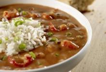 | Red Beans and Rice Soup with Cajun Chicken chicken thigh, red bean, andouille sausage, chicken stock, oil, thyme, pepper, paprika, garlic, tomato, salt, cajun seasoning, rice Enjoy this Cajun-spiced soup with some cornbread for a comforting meal. In a medium bowl toss together chicken and Cajun seasoning. In a 5- to 6-qt. Dutch oven heat oil over medium-high. Add half of t...