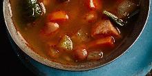 | Cajun Bean Soup Recipe | EatingWell collard greens, andouille sausage, chicken stock, olive oil, paprika, oregano, pinto bean, black-eyed pea, carrot, onion, garlic, celery, red wine vinegar, salt This healthy Cajun-inspired bean soup recipe features black-eyed peas, collards and a bit of andouille sausage. Serve it with cornbread and pass the hot sauce. Instructions Checklist Step 1 Heat oil...