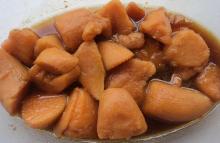 | Crisp Candied Sweet Potatoes Recipe butter, dried ginger, sweet potato, salt, brown sugar, water These are very good. I like them with ham but they are also good with chicken. Place potatoes in a large pan and cover with cold water then bring to boil and cook 10 minutes. Plunge potatoes into col...