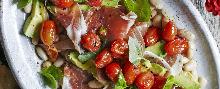| Cannellini bean, avocado and prosciutto salad recipe | olivemagazine cannellini bean, dry cured ham, olive oil, basil, avocado, lemon, tomato Use canned beans to boost a fresh tomato salad. With prosciutto and avocado this is Italian-style healthy eating that's ideal for midweek or a weekend lunch. STEP 1 Heat 1 tbsp olive oil in a pan...