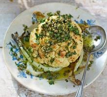 | Roast cauliflower with caper dressing recipe | BBC Good Food butter, olive oil, parsley, caper, lemon, cauliflower Cooking cauliflower this way gives it a richness that's balanced by the dressing. A great side dish for a roast dinner and it also works as a vegetarian main STEP 1 Heat oven to 190C/170C fan/gas...