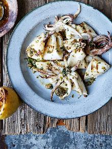 | Barbecued Squid With Charred Lemon And Caper Dressing Recipe | olivemagazine sesame seed oil, olive oil, parsley, paprika, jalapeno, caper, lemon, shallot, garlic, squid, honey Try this barbecued squid with charred lemon and caper dressing recipe. This easy recipe is great for a summer Sunday lunch. Make this squid recipe for a starter STEP 1 Heat the barbecue or a griddle ...