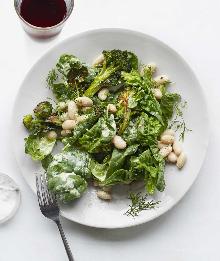 | Roasted Broccoli and White Bean Salad With Dijon-Caper Dressing Recipe | Real Simple cannellini bean, olive oil, dill, caper, spinach, broccoli, eggs, mustard, salt, lemon juice Get the recipe for Roasted Broccoli and White Bean Salad With Dijon-Caper Dressing. Instructions Checklist Step 1 Preheat the oven to 450 . Line a baking sheet with aluminum foil. Advertisement St...