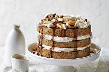| Hazelnut cake with whipped ricotta and coffee caramel recipe - Recipes - delicious.com.au butter, icing sugar, ricotta cheese, hazelnut, vanilla pod, eggs, baking powder, sugar, coffee, sour cream, cream, flour This ricotta-filled cake is topped off with coffee, caramel and hazelnut flavours, making it the ultimate decadent dessert. 1. Preheat oven to 160 C. Grease three 20cm round cake pans and line base a...