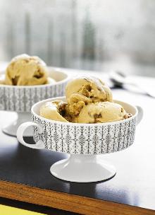 | Caramel-Apple Ice Cream Recipe butter, ginger cookie/biscuit, cinnamon, apple, sugar, chocolate, vanilla ice cream, dulce de leche liqueur Swirling caramelized apples with dulce de leche into vanilla ice cream makes for a delicious treat. Melt the butter in a medium skillet. Add the apples and cook over moderate heat, stirring, until sof...