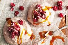 | Chocolate meringues with raspberries and caramel sauce - Recipes - delicious.com.au butter, icing sugar, cornstarch, vanilla extract, raspberry, white vinegar, brown sugar, sugar, cocoa powder, cream Let these memorable chocolate meringue desserts inspire your baking repertoire! 1. Preheat the oven to 150 C. Line a large baking tray with baking paper. 2. Whisk eggwhites in the bowl of an electr...