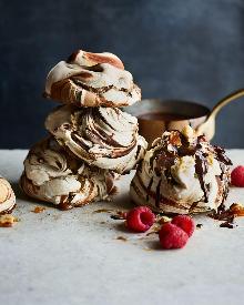 | Chocolate swirl meringues with praline and chocolate caramel sauce recipe | delicious. magazine butter, egg whites, hazelnut, raspberry, muscovado, sugar, dark chocolate, double cream, yogurt (plain) Our chocolate and brown sugar swirl meringues make an impressive dessert topped with the hazelnut praline and chocolate caramel sauce. Heat the oven to 120 C/100 C fan/gas 1⁄2. Put the egg white...
