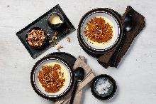 | Baked salted caramel rice pudding recipe - Recipes - delicious.com.au egg yolks, risotto rice, pecan, nuts, vanilla pod, sugar, cream Combine your winter favourites with this salted caramel rice pudding. 1. Preheat oven to 150 C fan (170 C conventional). 2. Place sugar a medium ovenproof frypan or skillet over medium heat. Once t...