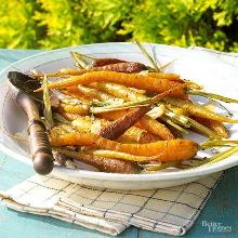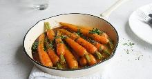 | Caramelised carrots & onions recipe | BBC Good Food butter, red onion, olive oil, thyme, carrot, balsamic vinegar, brown sugar, red wine The perfect caramelised carrots to accompany any roast from BBC Good Food. STEP 1 Blanch carrots in a pan of boiling salted water for 3 mins, drain well, then pat dry. In a large pan, melt the butter...