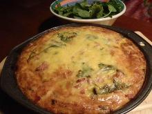 | Caramelised Onion and Potato Frittata | Australia's Best Recipes oil, lemon thyme, potato, onion, spinach, eggs, bacon, balsamic vinegar, cheddar cheese, brown sugar, milk Caramelised onion and potato frittata, with bacon and spinach. Grease a 19 cm round cake pan, line base with baking paper and set aside. Place onions in large, heated, oiled saucepan and cook, stirri...