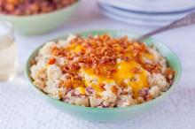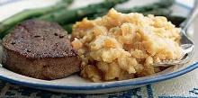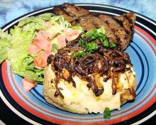 | Steakhouse Caramelized Onion Mashed Potatoes Recipe - Food.com butter, red potato, canola oil, pepper, onion, garlic, bacon, salt, cheddar cheese, sour cream, milk Can substitute fat-free sour cream, fat-free milk and reduced fat cheddar cheese. From Taste of Home. Serving Size: 1 (203) g Servings Per Recipe: 6 AMT. PER SERVING % DAILY VALUE Calories: 207 Ca...