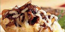 | Caramelized Onion-Stuffed Baked Potato Recipe | MyRecipes butter, red onion, dry sherry, thyme, pepper, potato, garlic, worcestershire sauce, salt, cheese, sugar, sour cream Baking the potato in the microwave makes this dish a snap to prepare. Fontina, mozzarella, or even Parmesan would work in this dish. Serve with filet mignon or flank steak. Instructions Checklist Ste...