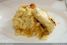| Russian Potato Casserole with Caramelized Onions Recipe butter, heavy cream, sweet onion, chicken stock, olive oil, dill, potato, eggs, sugar, sour cream Mashed potato casserole with serious flavor from some slowly caramelized onions. Melt the 5 tablespoons butter in a large skillet or Dutch oven. Add the oil and heat. Add the onions, stir to coat an...