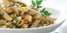 | Whole-Grain Penne With Walnuts, Caramelized Onions, and Ricotta Recipe - Food.com ricotta cheese, olive oil, walnut, pepper, parsley, onion, salt, pasta, sugar, lemon juice Sunset, FEBRUARY 2007 Serving Size: 1 (176) g Servings Per Recipe: 8 AMT. PER SERVING % DAILY VALUE Calories: 411.4 Calories from Fat 231 g 56 % Total Fat 25.8 g 39 % Saturated Fat 2.9 g 14 % C...