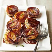 | Caramelized Balsamic Onions butter, chicken stock, olive oil, thyme, pepper, onion, balsamic vinegar, salt, sugar, white wine, water Pair these roasted onions with grilled steak or shrimp for a restaurant-worthy dinner. Preheat oven to 425 F. In 3-quart rectangular baking dish combine butter and olive oil. Whisk in vinegar, wine, s...