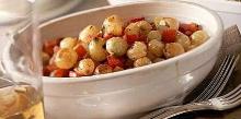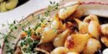 | Caramelized Pearl Onions butter, thyme, pepper, onion, salt, vegetable fat spread, sugar Step 1 In large bowl, place pearl onions and enough very hot water to cover; set aside 5 minutes to soften onion skins. Peel onions, leaving a little of root end attached to help onions hold their sha...