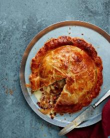 | Vacherin pithivier with caramelised onions and bacon recipe | delicious. magazine pancetta, puff pastry, thyme, onion, eggs, icing, white wine, flour Remove the top of the box from the cheese, then snip away the box around the sides and peel off the thin wooden spruce coating from the skin of the cheese. Keep it on its wooden base and put in the fr...