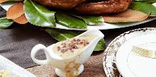 | Best Bacon-Caramelized Onion Gravy - How to Make Bacon-Caramelized Onion Gravy chicken stock, thyme, pepper, onion, bacon, salt, flour Upgrade your Thanksgiving turkey with this bacon gravy recipe from Delish.com. In a large skillet over medium heat, cook bacon until crisp, 8 minutes. Transfer to a paper towel-lined plate and crumble...