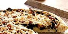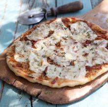 | Alsatian Pizza with Bacon and Caramelized Onions recipe | Epicurious.com butter, bread flour, yeast, cornstarch, olive oil, thyme, pepper, onion, bacon, salt, cheese, brown sugar, sugar, water 1. To make the pizza dough, in a bowl, whisk together the water, yeast, and sugar. Let stand until foamy, about 5 minutes. Add the flour, oil, 1 teaspoon salt, and 1/2 teaspoon pepper. Stir until the ...