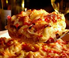 | Spinach, Caramelized Onion, and Bacon Pizza Recipe | MyRecipes butter, bread flour, yeast, cornstarch, cooking spray, pepper, onion, garlic, spinach, bacon, salt, dough, parmesan cheese, sugar, milk, water, flour You might never guess that this gourmet pizza is fiscally modest. Its cooking techniques render it rich: A tender homemade crust is topped with a garlic-enhanced white sauce, which is then embellished...