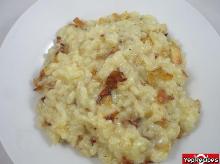 | Caramelized Onion Risotto With Bacon and Parmesan Recipe - Food.com risotto rice, chicken stock, oil, thyme, pepper, onion, garlic, bacon, salt, parmesan cheese A delicious creamy Italian dish Serving Size: 1 (730) g Servings Per Recipe: 4 AMT. PER SERVING % DAILY VALUE Calories: 858.3 Calories from Fat 355 g 41 % Total Fat 39.5 g 60 % Saturated Fat 14....