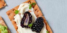 | Blackberry & Cream Cheese Cracker Recipe | EatingWell crispbread, mint, blackberry, cream cheese Fresh blackberries and light cream cheese make a pretty, sweet topping for a crispbread snack, especially with a little mint sprinkled on top. Besides being beautiful and delicious, blackberries are p...