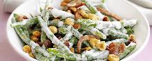 | Green beans with soured cream dressing recipe | olivemagazine oil, hazelnut, green beans, bacon, sour cream Green beans with soured cream, bacon and hazelnuts makes for a delicious, crunchy side dish. STEP 1 Cook the green beans in lightly salted boiling water for 4-5 minutes, or until cooked but still al ...