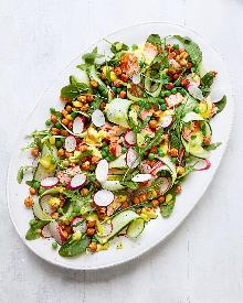 | Hot-smoked salmon and crispy chickpea salad recipe | delicious. magazine smoked salmon, english mustard, salad, olive oil, chickpea, radish, cucumber, lemon juice This crispy chickpea and hot-smoked salmon platter is packed with flavour and texture and, most importantly – it will fill you up! Heat the oven to 220 C/200 C fan/gas 7. Toss a the chickpeas wi...