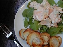 Warm Salmon Salad With Crispy Potatoes Recipe - Food.com olive oil, potato, shallot, garden rocket, salmon, salt, rice vinegar, buttermilk This salad is remarkable. The potatoes fry up crispy on the outside and tender on the inside of the thin slices and provide a hearty balance to the slightly tangy dressed salmon and the spicy arugula ...