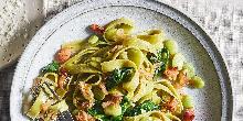 | Spinach, Lima Bean & Crispy Pancetta Pasta Recipe | EatingWell pancetta, olive oil, rosemary, lima bean, shallot, garlic, spinach, pecorino cheese, pasta, lemon juice We opt for fresh spinach pasta here--it cooks quickly and adds a pop of color. Cooking lima beans in pancetta drippings infuses them with flavor. Instructions Checklist Step 1 Bring a medium saucepa...