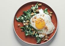 | Spinach and crispy bacon salad with fried egg recipe - BBC Food butter, olive oil, pepper, lemon, potato, onion, spinach, eggs, bacon, salt Heat the oil and butter together in a non-stick frying pan, add the onion and fry gently until soft but not coloured. Add the bacon and fry until golden-brown. Add the potatoes and cook over a moder...