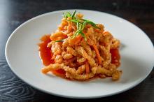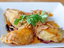 | Crispy Fish With Sweet-And-Sour Sauce Recipe | CDKitchen.com red bell pepper, hot sauce, lemon peel, cornstarch, oil, ginger root, dried onion, dried garlic, bass, red wine vinegar, salt, baking powder, sugar, pineapple juice, water, flour Fish fillets are coated in a light batter and then fried until crisp and golden brown. Serve with the included sweet and sour sauce recipe or with tartar sauce if desired. Combine the flour, oil, baki...